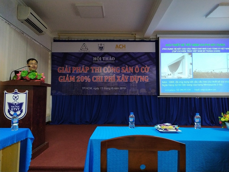 Nhận lời mời của Khoa Kỹ Thuật Xây Dựng của Đại Học Giao Thông Vận Tải TP.HCM, Giám Đốc Công Ty CP Tư Vấn Xây Dựng ACH, TS. Nguyễn Xuân Hoàng đã trình bày tại hội thảo với đề tài: “Giải pháp thi công sàn ô cờ ACH, giảm 20% chi phí xây dựng”. Giải pháp sàn ô cờ ACH đã được Công ty CP tư vấn xây dựng ACH ứng dụng cho nhiều công trình tại các tỉnh, thành phố như: Hà Nội, Tp.Hồ Chí Minh, Bình Định, Huế, Quảng Ngãi, Quảng Bình, Bình Dương, Ninh Bình, Sóc Trăng,…; Ngoài ra, sàn ô cờ cho chung cư, khách sạn, trung tâm thương mại, trường học, nhà máy, văn phòng, nhà ở….